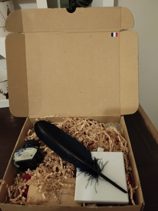 Coffret d’écriture poétique Pause Lettres comprenant un carnet, un stylo en bois et des éléments choisis avec soin, présenté dans un coffret kraft préparé à la main. Une plume d’oie taillée en biseau, pour une écriture authentique.